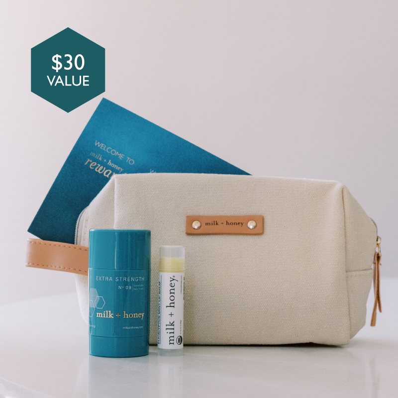 All new Premium Members will receive a welcome gift featuring a milk + honey canvas bag, travel-sized Extra Strength Deodorant (blend varies), and a milk + honey Lip Balm (blend varies).